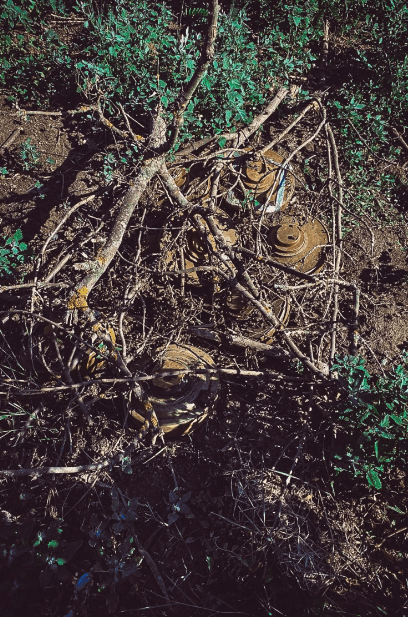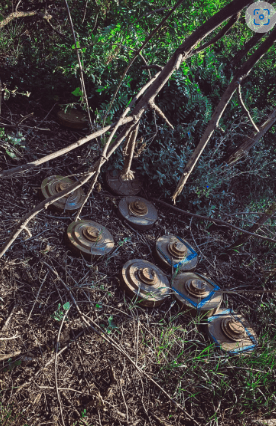 Russerne sætter konstant miner på snubletråde, selvom dette er forbudt i henhold til international humanitær lov. Det er næsten umuligt at se fiskelinjen i skoven – det eneste der hjælper, er morgenduggen, der samler sig på den. Russiske skyttegrave i skoven er også vanskelige at rydde for miner. Sprængstoffer er svære at få øje på i græsset, især når dine øjne bliver trætte. Gutterne er opmærksomme på det visne græs – det er meget sandsynligt, at der er en mine. Det visne kommer af, at planten blev rykket op og placeret ovenpå.